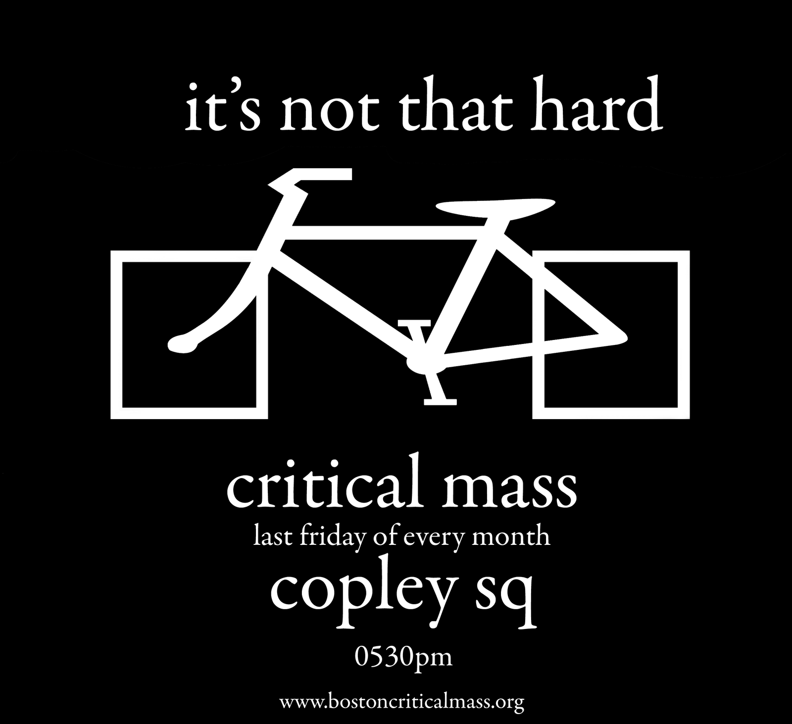 Come on out to Copley Sq. this evening to ride with ~300 cyclists through the streets of Boston. People generally start to arrive around 5:30, and the ride usually leaves by 6 pm. If you have never ridden in a CM before, a few details: