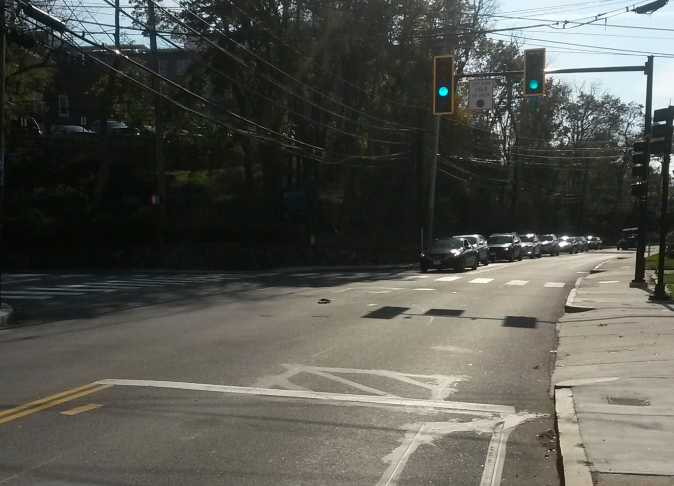 Another issue at this same intersection is that many westbound motorists pull forward past the stop line, but there is then no loop under their vehicle and the light does not change. Drivers do this so they can look left to check whether it is safe to turn right on red, but some also do it when they intend to travel straight across the intersection or turn left.